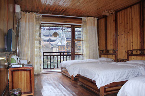 古樸的客房內,超大陽臺全景落地窗,是您欣賞沱江風光帶首選客棧,兩座百年四合院內小橋流水,假山錦鯉,一百三十平米休閑花園別具情調。紅酒加咖啡的大堂吧、彩色精致的情調房、古典高雅的臨江觀景房以及大型公共觀景平臺,龍閣的點點滴滴都透著出古城的神韻和幽靜,走進龍閣客棧,給您一個完美的鳳凰古城沱江全景!