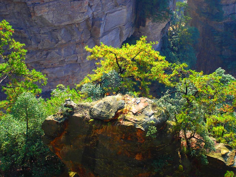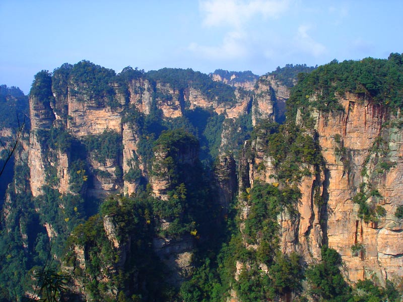 與袁家界后花園觀景臺(tái)遙遙相對(duì)。海拔949米,相對(duì)高度400多米,頂部面積3公頃。因野山羊多而得名。整座石峰,東、西、南三面皆絕壁,唯北面一徑可上。頂部為一平緩的狹長(zhǎng)石梁,長(zhǎng)近500米,寬20~30米,呈東西向,布滿原始次生林。向西伸出三道小石梁,長(zhǎng)10~20米,寬2~3米,前沿皆是高危奇絕的凌空觀景臺(tái)。立臺(tái)上,仿佛置身云端,鳥瞰金鞭溪、舍刀溝,宛如絲帶隱現(xiàn)于峰谷綠叢中。放眼四圍,千百座石峰,環(huán)列足下,浩浩蕩蕩,如劍朝森列,如將軍布陣,如古塔競(jìng)姿。西面7對(duì)石峰似七對(duì)情侶,男俯女仰,對(duì)面而立。民國(guó)年間,此寨是土匪巢穴,留有卡門、殘堡、斷壕、屋場(chǎng)、水井、破臼、磨坊等殘跡。 |
