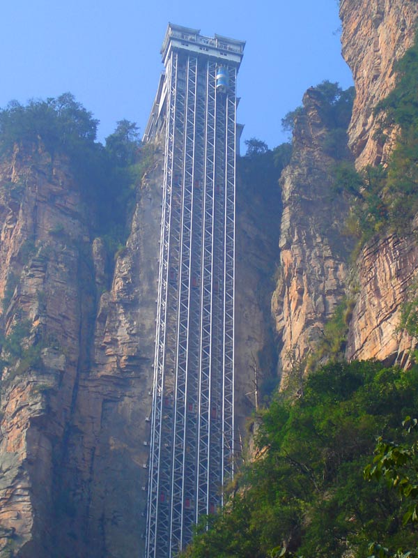 百龍?zhí)焯,垂直高?35米,運(yùn)行高度326米,由154米山體內(nèi)堅(jiān)井和172米貼山鋼結(jié)構(gòu)井架等組成,采用三臺(tái)雙層全暴露觀光電梯并列分體運(yùn)行,每臺(tái)次載客50人次,運(yùn)行速度3米/秒,三臺(tái)同時(shí)運(yùn)行每小時(shí)往返量達(dá)4000人次。百龍?zhí)焯莸男藿▽?shí)現(xiàn)“山上游,山下住”的目標(biāo),提供了交通保障,將袁家界天下第一橋、迷魂臺(tái)、天懸白練以及烏龍寨、楊家界等絕世美景從幕后推向了前臺(tái),并將天子山、袁家界、金鞭溪等精品旅游線路連為一體,解決了多年困擾景區(qū)的交通瓶頸問題。