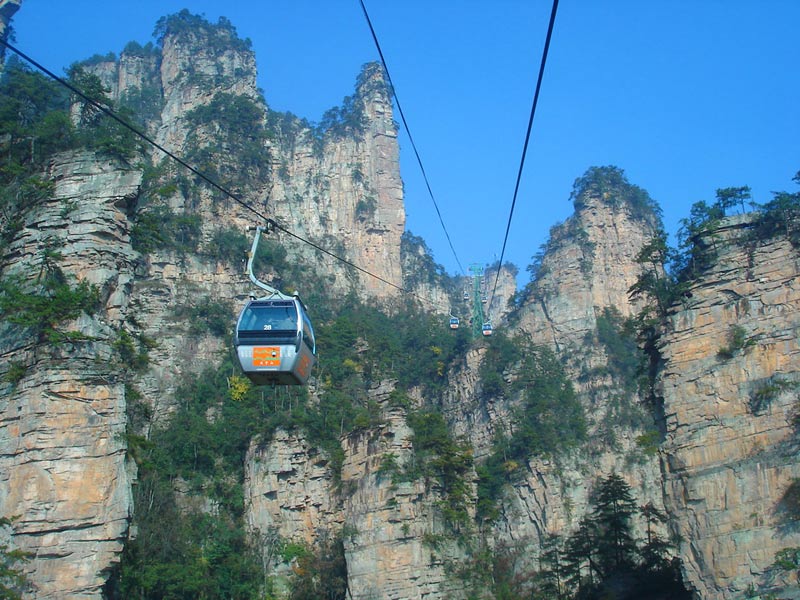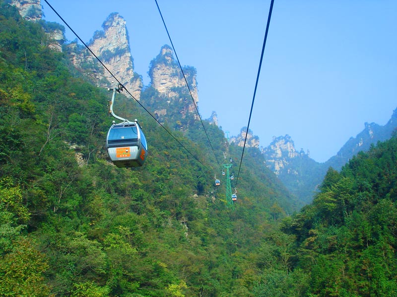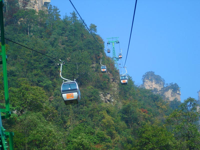 天子山索道 天子山索道的建成開(kāi)通,極大地改善了武陵源風(fēng)景區(qū)的旅游交通環(huán)境,使游人花半日功夫上得天子山來(lái)只看一眼的遺憾,變成了間歇飛渡上山便可盡覽天子山這“擴(kuò)大的盆景,縮小的仙境”的迷人景色之享受。乘坐天子山索道,既舒適又安全,沿線風(fēng)光奇絕,奇松怪石,莽莽翠林,幽幽泉水,嬉戲獼猴,盡收眼底,令人嘆為觀止。尤其在云霧繚繞之時(shí),游客乘坐索道更能體驗(yàn)到神仙飄逸飛行的動(dòng)感與刺激。