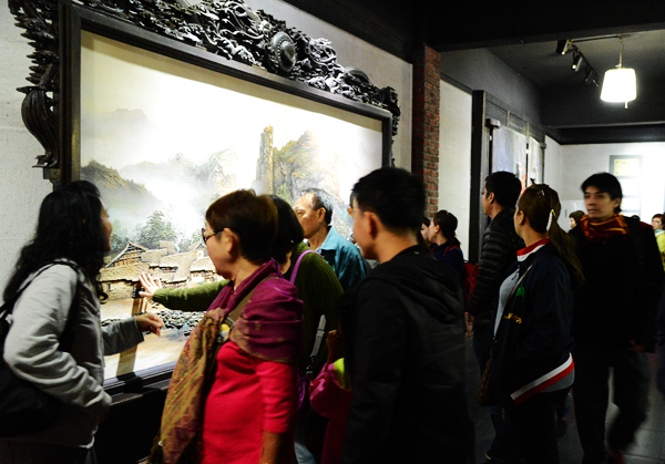 一批馬來(lái)西亞客人在參觀砂石畫