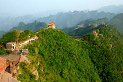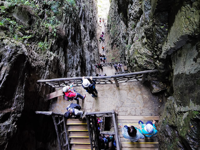 天梯棧道的木板很窄,依次往下延伸,就像一架天梯,把我們送往迷人的仙境。這道“天梯”不是天賜的,而是靠了當(dāng)?shù)氐纳矫,腰系繩索,手扶峭壁,肩扛背馱,將這些堅(jiān)硬而沉重的石頭從山頂一塊一塊地運(yùn)來(lái)、鋪好,鋪成現(xiàn)在這條看似險(xiǎn)峻、其實(shí)結(jié)實(shí)安全的1600多級(jí)石階棧道。